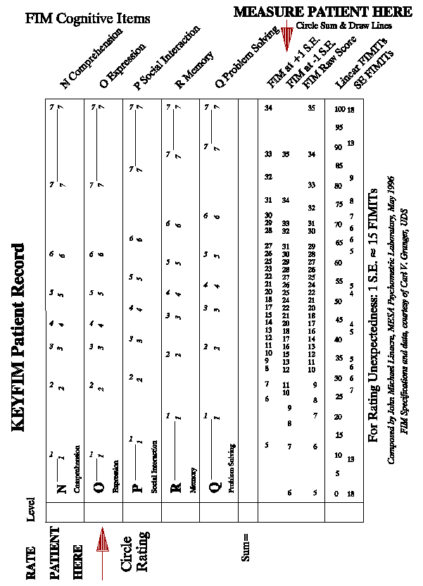 The KeyFIM form is used for data collection, then measurement construction, and finally diagnostic analysis. First, the form is turned on its side for data collection. The rating given to each item is recorded, and the corresponding value circled on the pre-calibrated expected-score scale (obtained from a calibration run using normative data, and reported in BIGSTEPS Table 2.2). When extreme ratings are observed (1 and 7 in the KeyFIM), the circle extends from the printed extreme rating value to the edge of the active area.