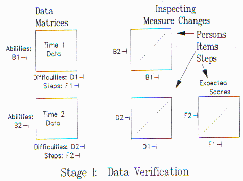 Rasch analysts proceed at least to Stage I (see Figure 1). Here the Time 1 and Time 2 data are analyzed independently. This aids the detection and elimination of gross errors in data entry and test administration. It also permits a rough verification of the stability of the frame of reference by plotting the item difficulty calibrations at Time 2 (D2-I) against those at Time 1 (D1-I). A close fit to the identity line is reassuring. For each rating scale, cross-plotting key points on the expected score ogives for Time 1 and Time 2 (derived from F1-I and F2-I) and then observing fit to the identity line verifies approximate scale stability. When these item and rating scale plots indicate stability, then the plot of ability measures for Time 2 (B2-I) against Time 1 (B1-I) provides a dependable picture of person changes.