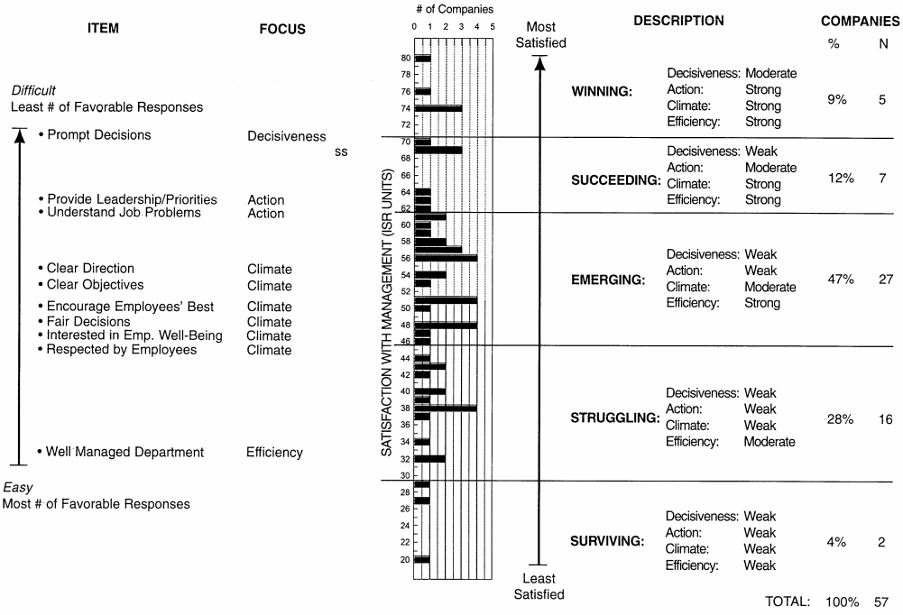 We now have a theory of management. But how does it relate to the corporations? The bar chart shows the distribution of companies in rescaled logits. At the bottom, around 20, even departmental efficiency has not been achieved. At the top, around 80, managers have surpassed the range of performance probed by the questionnaire. Again, the bar-chart provides too much detail. The fairly uniform spread of corporations must also be summarized. After more thought, we achieved this in the column labelled DESCRIPTION. 5 stages are identified. For companies near the bottom, labelled (JUST) SURVIVING, even routine management tasks are almost too much to handle. At the top, labelled (POTENTIALLY) WINNING, are managers eager to take on new challenges and become world leaders in business.