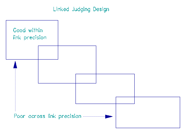 Less data intensive, but also less precise, Rasch estimates can be obtained so long as overlap is maintained. Fig. A.7 illustrates such a reduced network of observations which still connects examinees, judges and items. The parameters are linked into one frame of reference through 180 ratings which share pairs of parameters (common essays, common examinees or common judges). Accidental omissions or unintended ratings would alter the judging plan, but would not threaten the analysis. Measures are less precise than with complete data because 83% less observations are made.